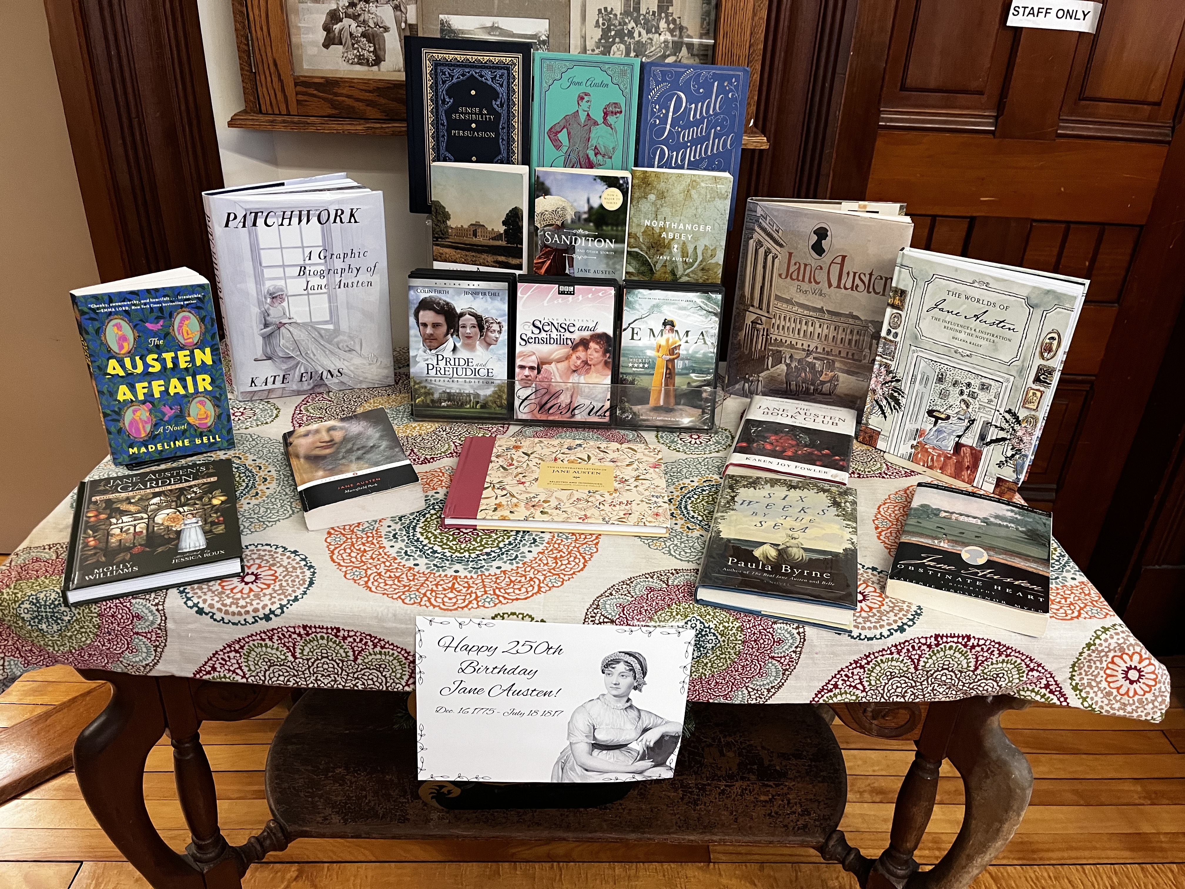 Come check out one our Regency era love stories by Jane Austen and or a movie to celebrate this amazing authors' 250th Birthday. Whether you're a longtime fan or even if you have never read any of her books, now is a great time to reread or read for the first time and fall in love with these regency romance novels. We will also be celebrating the Birthday of Jane Austen on December 17th at 6pm with a Regency Tea. Come join the fun!